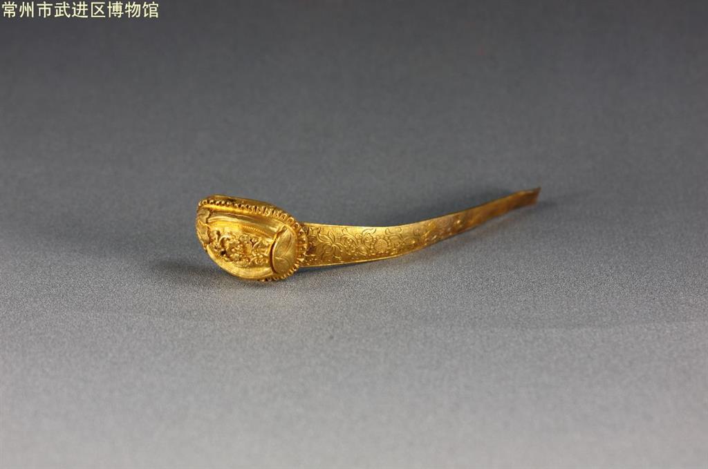 明代金发簪 长12.5厘米 金质。簪首锤鍱成椭圆形,中间饰含苞的牡丹,两旁錾出缠枝卷草纹。牡丹花瓣突起,花瓣上錾刻有细纹。簪脚正面刻有芙蓉、菊花等花卉纹饰。簪脚向后平伸,略有弧度。整器工艺精湛,华丽异常。