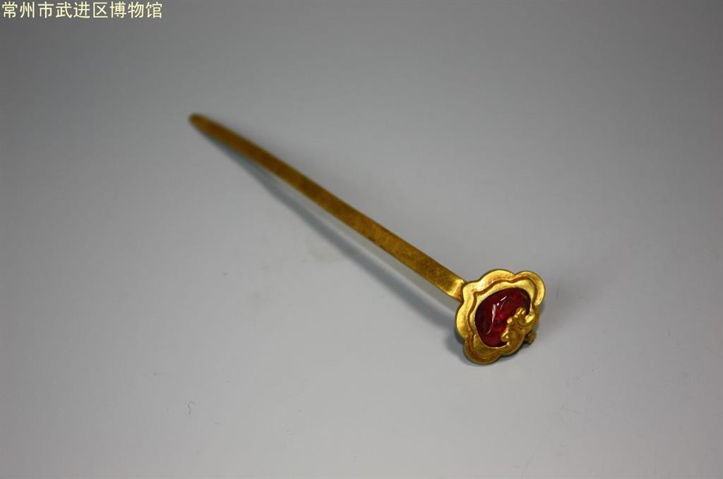 金质。簪首为如意形,中间镶嵌大颗红宝石。背面饰镂空钱币纹。簪身扁平,做成如意柄形,尾部变直细。材质上乘,造型简单却不失典雅。
