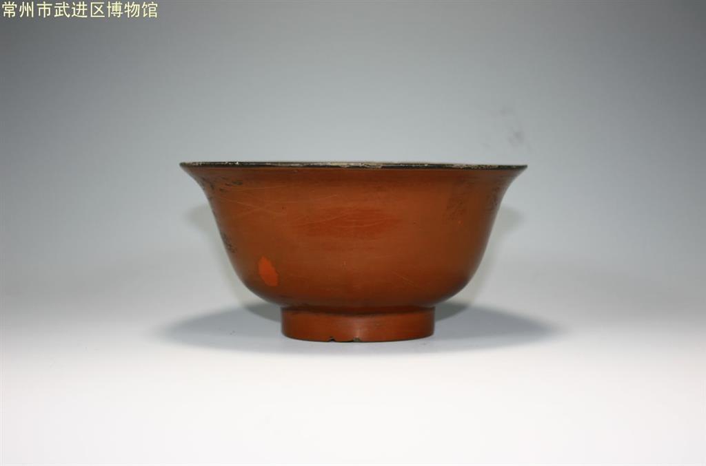敞口,弧腹,圈足。表面髹赭色漆,口沿及圈足内均髹黑色漆。碗底正中朱书八思巴文,译成汉字为“陈”