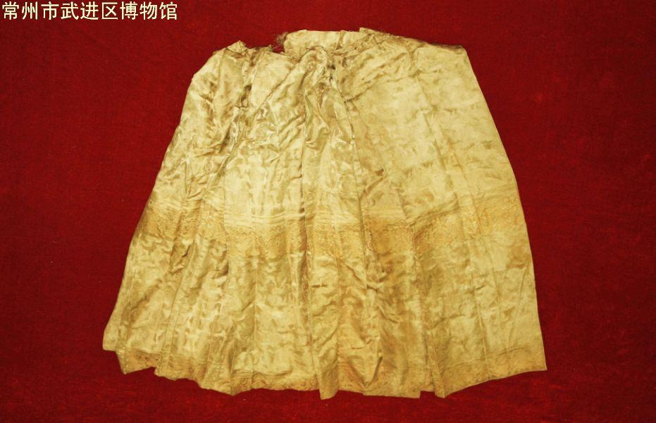 面料为黄绿色花缎。裙为多裥式,两侧各有8个裥,有马面,无腰。裙中段用捻金线织有宽11.3厘米的饰带,饰有有六吉、莲花、宝瓶和幡状纹等。下摆处用捻金线织有宽6.5厘米的幡状纹饰带。整条裙虽为半成品,却给人一种奢华之感。