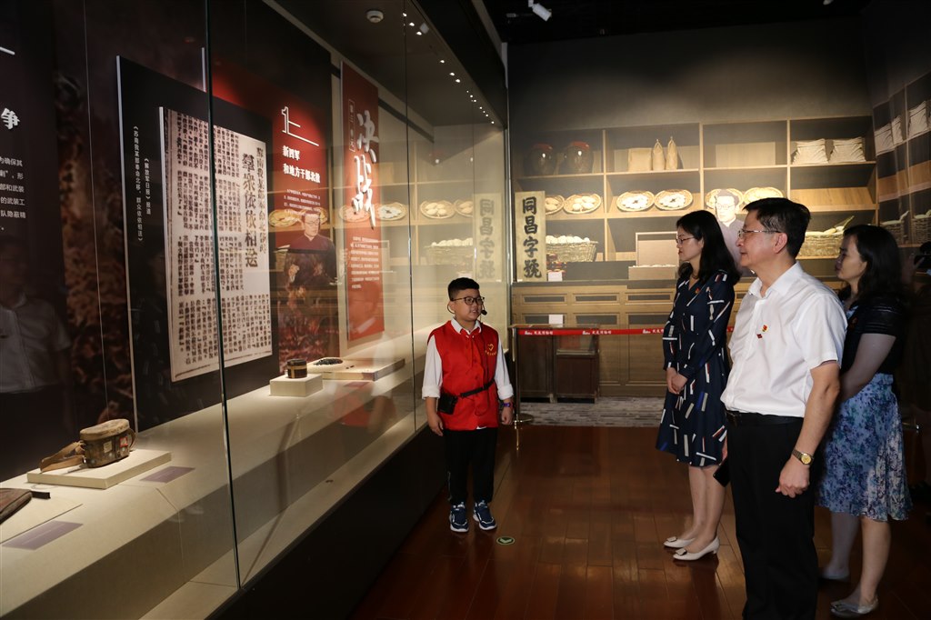 为庆祝中国共产党成立100周年,6月30日上午,“红色印记——常州革命文物史料展”在武进博物馆特展厅开展。武进区委宣传部副部长、文明办主任戚清萍,武进文体广电和旅游局领导班子所有成员,局下属单位各支部书记、党员代表,武进青少年活动中心师生等共同出席了开幕式。