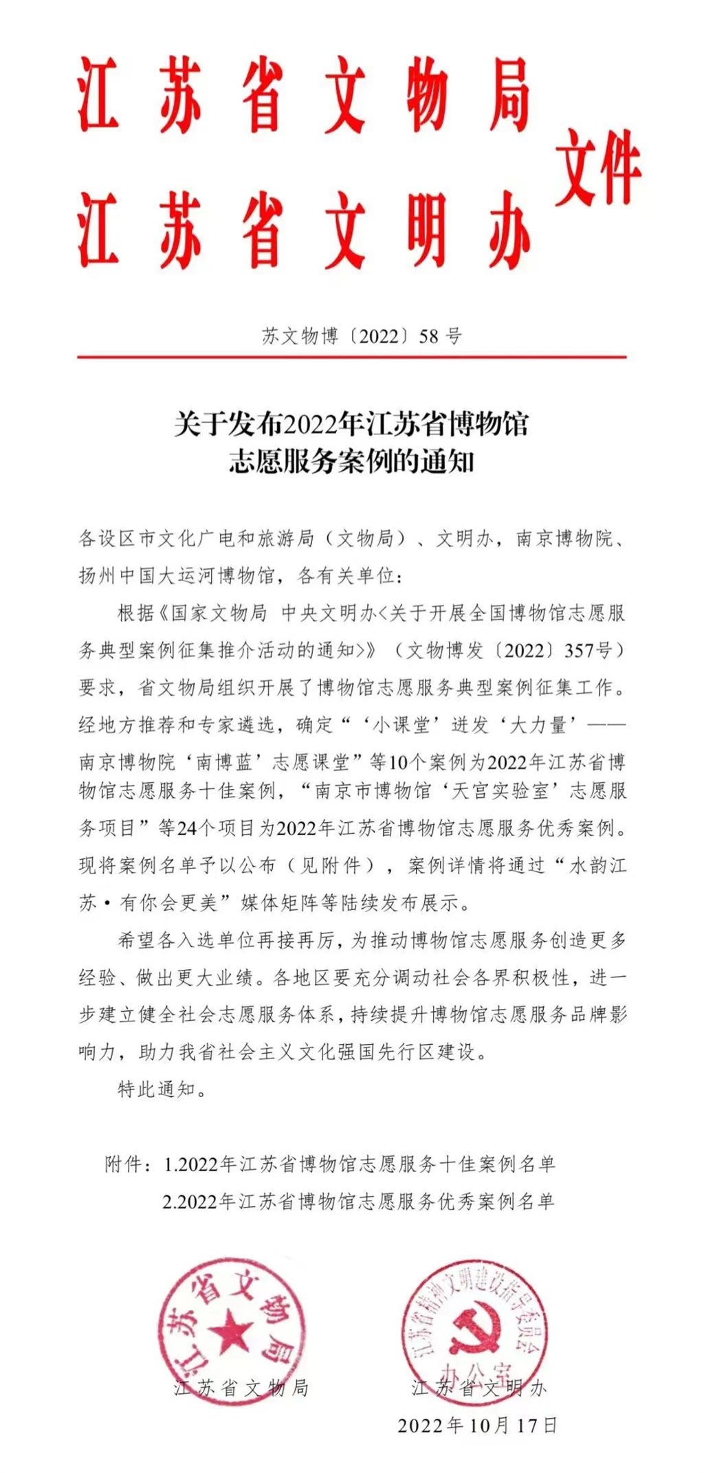 近日,根据江苏省文物局、江苏省文明办联合印发的《关于发布2022年江苏省博物馆志愿服务典型案例的通知》,我馆“武博教育推广人”志愿服务成功入选2022年江苏省博物馆志愿服务优秀案例名单。